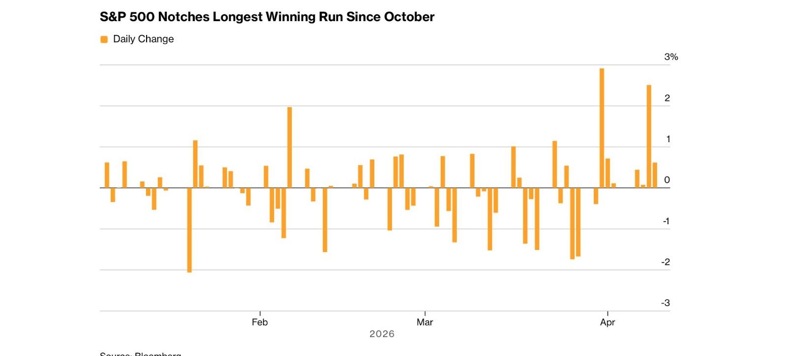 The S&P 500 rose 0.6%, marking its seventh straight gain and longest winning streak since October, after Israel agreed to direct talks with Lebanon, easing fears of further escalation in the region.